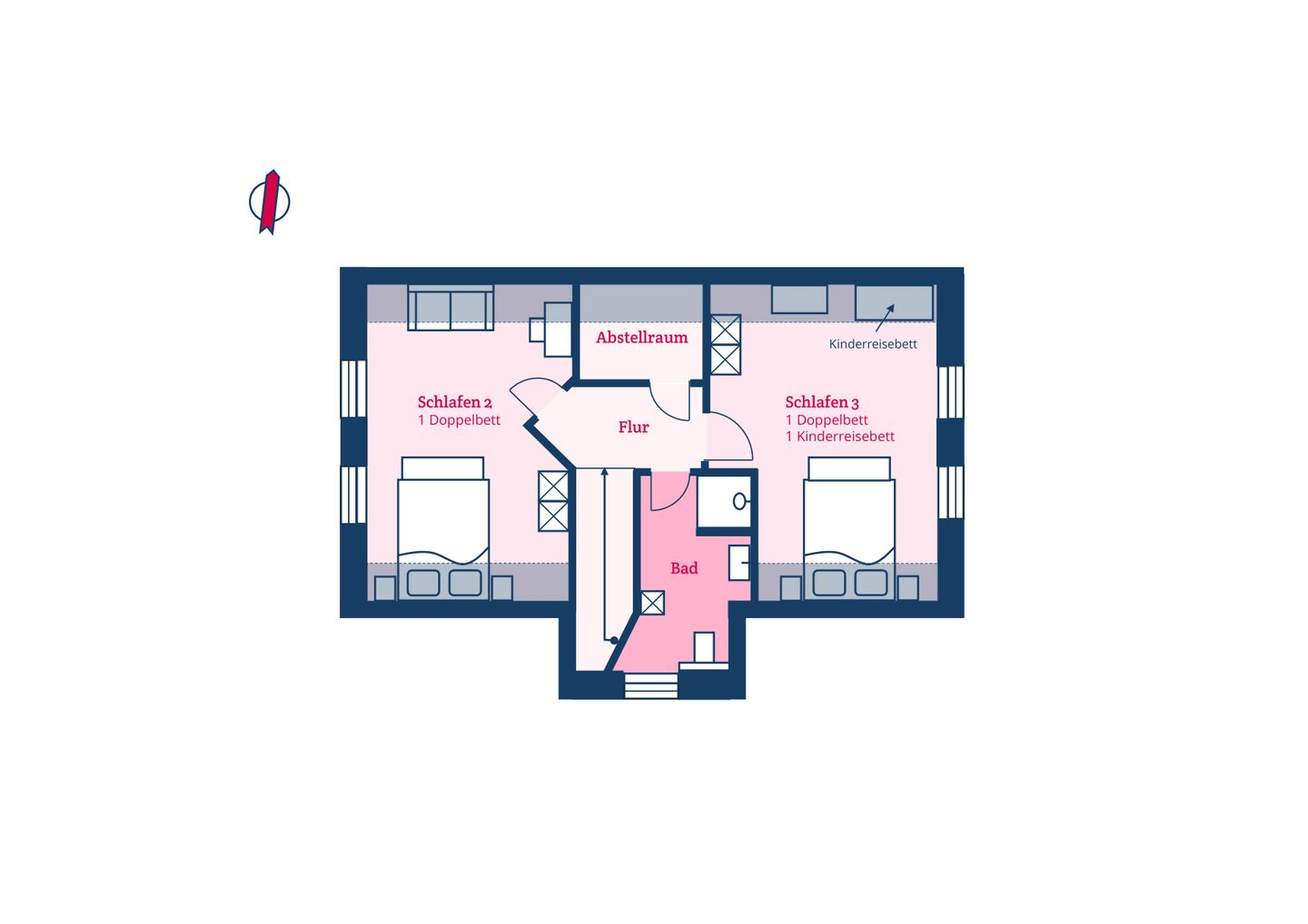 Im Obergeschoss sind zwei weitere Schlafzimmer - jeweils mit einem Doppelbett ausgestattet - sowie das zweite Duschbad gelegen. Alle Schlafzimmer sind mit einem TV ausgestattet, ein Doppelbett-Zimmer verfügt über einen Schminktisch. In beiden Bädern befinden sich Radios, die in eine Wand eingelassen sind und über den Lichtschalter bedient werden.