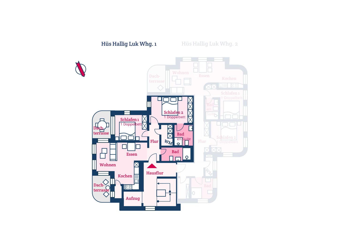 Die hochwertig eingerichtete Wohnung ist vollständig im 1. Obergeschoss gelegen und über einen Aufzug zu erreichen. Sie unterteilt sich in einen großzügigen Wohn- und Essbereich mit offener Küche, ein Schlafzimmer mit Bad en Suite, ein Schlafzimmer mit Südost-Dachterrasse, ein zweites Duschbad und einen Hauswirtschaftsraum mit Waschmaschine. Die Schlafzimmer sind jeweils mit einem Doppelbett und einem Smart-TV ausgestattet. Über den Wohnbereich gelangen Sie auf die zweite, östlich ausgerichtete Dachterrasse.